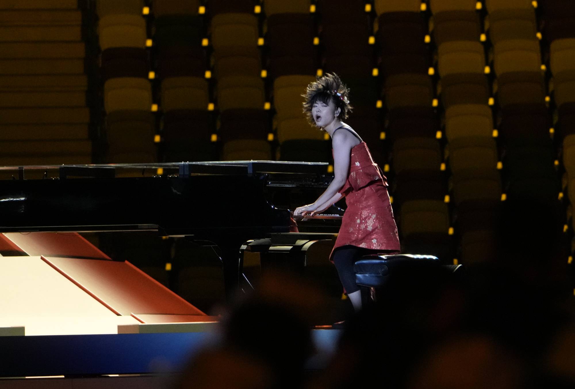 While never going huge on pop culture, this latter stretch saw the opening ceremony loosen up, weaving in humor and a mish-mash of culture as kabuki star Ichikawa Ebizo performed alongside kinetic jazz pianist Hiromi Uehara, who energetically pounded the keys of her instrument. Part of the charm came from the feeling that this portion was either inspired by or borrowed from the original plan, boasting the energy of choreographer Mikiko Mizuno and musician Sheena Ringo.