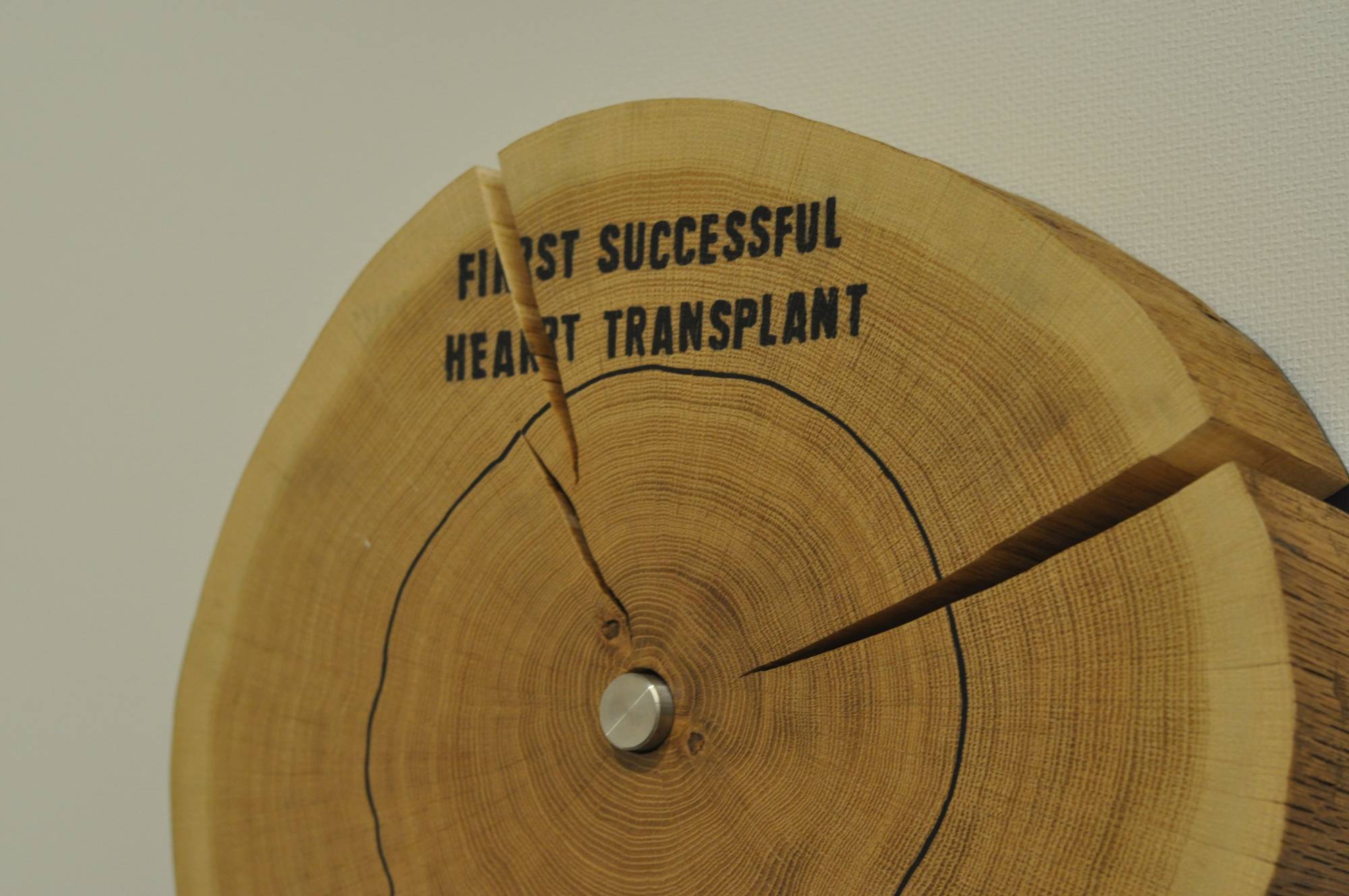 Roman Ondak’s “Event Horizon” comprises an oak tree trunk sliced into 100 pieces. Each disk is marked with its human calendar year and a corresponding major world event, like “Germany reunited” and “Warsaw pact signed,” spanning 1917 to 2016. Each day a disk is taken from the floor and added to the wall.