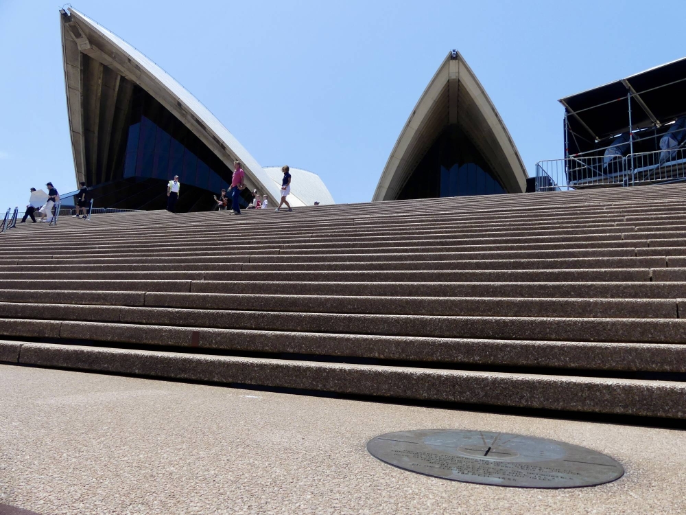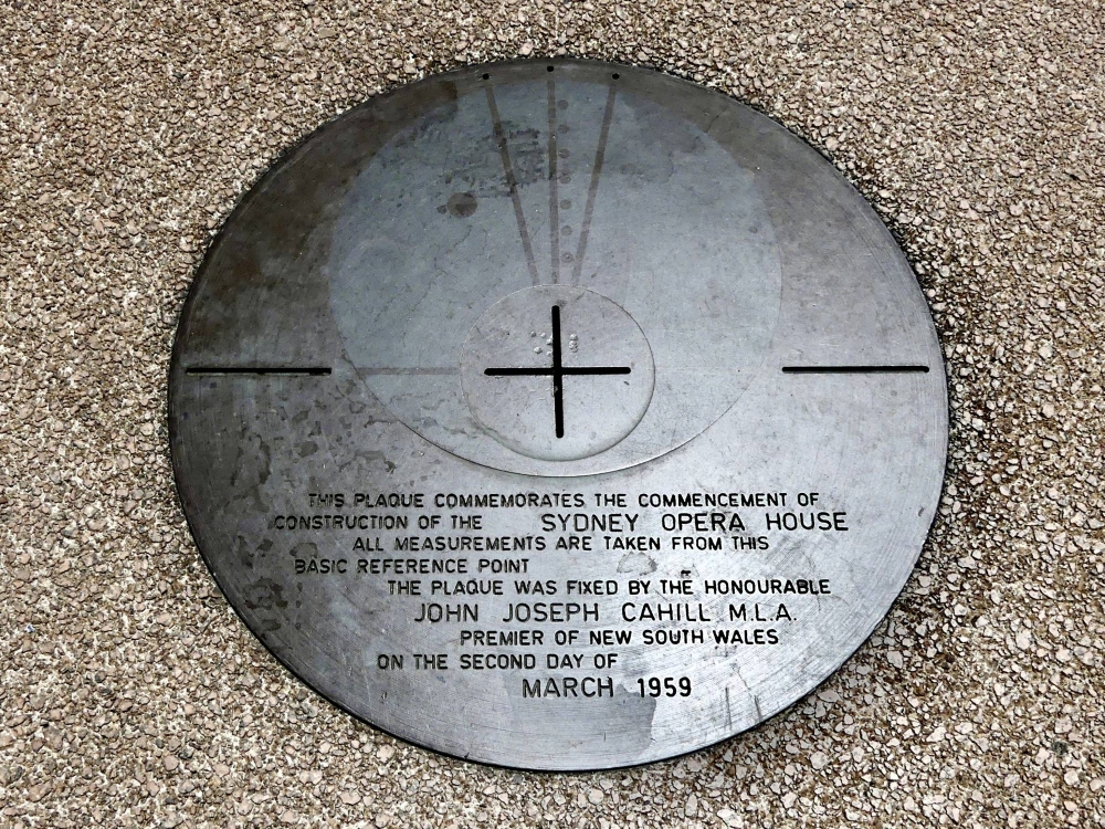 One of Mikami’s earlier tasks was to design a plaque to commemorate the start of the construction. Asked by Utzon to come up with something unique, he proposed that a round plaque, rather than a conventional rectangle, be placed at a point where the center lines of the roofs of the two halls merge when they are extended toward the edge of the concourse. He likened the plaque to the navel of a human body. Utzon immediately liked and adopted the idea, according to Mikami's book.