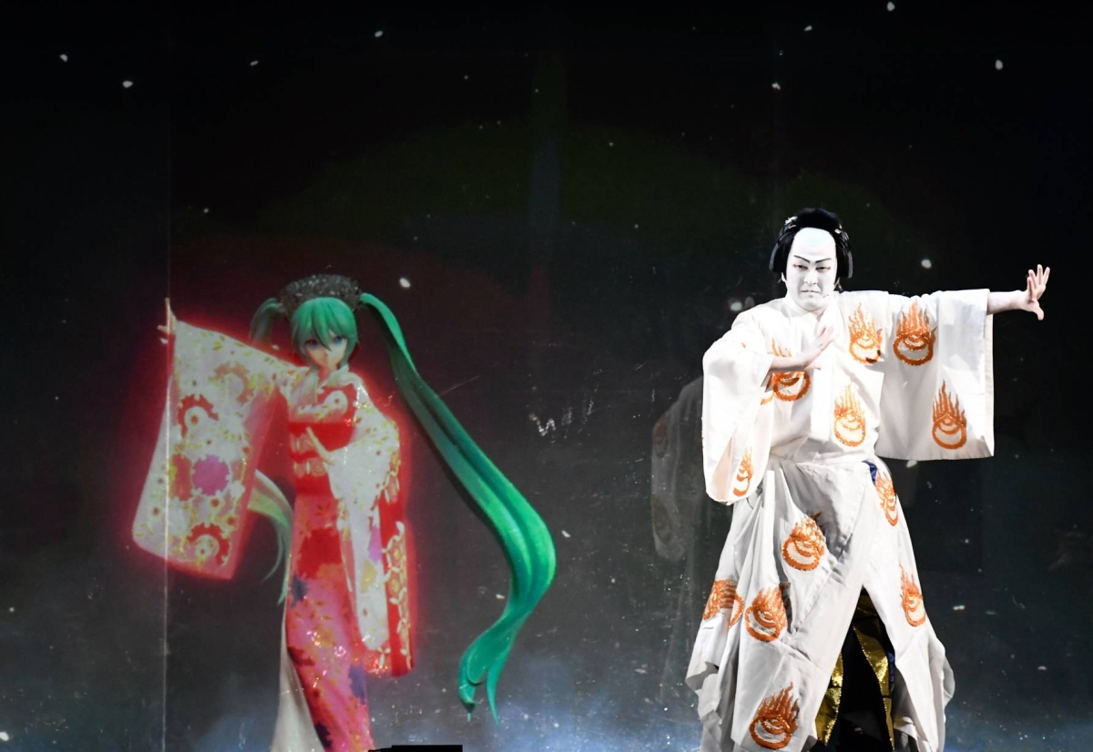 The 2016 show was the result of a collaboration between the telecommunications company NTT, media company Dwango and Shochiku, an entertainment and kabuki management company, aiming to utilize new technology to promote traditional culture. They decided to create a production with a new performer — Hatsune Miku, a virtual idol whose voice is created using Vocaloid software. This gave birth to the original piece "Hanakurabe Senbonzakura” (which combines “Senbonzakura,” one of Miku's signature songs, and the classical kabuki play "Yoshitsune Senbonzakura"). Set in the world of gods, Miku stars as a princess, and sings and dances with Nakamura and other professional kabuki performers, who play spirits in a story of good vs. evil that spans a millennium.