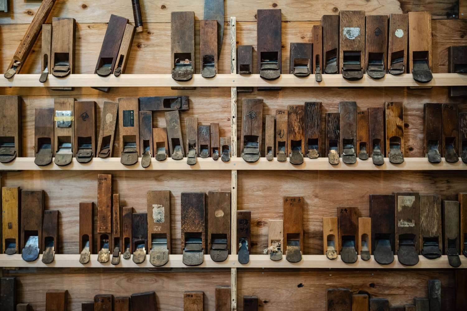 In his Shiga Prefecture workshop, the sturdy, heavy-set man with a trim beard sits among 300 hand planers and rooms full of timber. With a cap pulled down over his eyes, Nakagawa dresses simply, often appearing in plain khaki-colored pants and a navy blue shirt, seeming ready at any time in any place to shave a piece of wood. But his woodworker look belies an articulate erudition.
