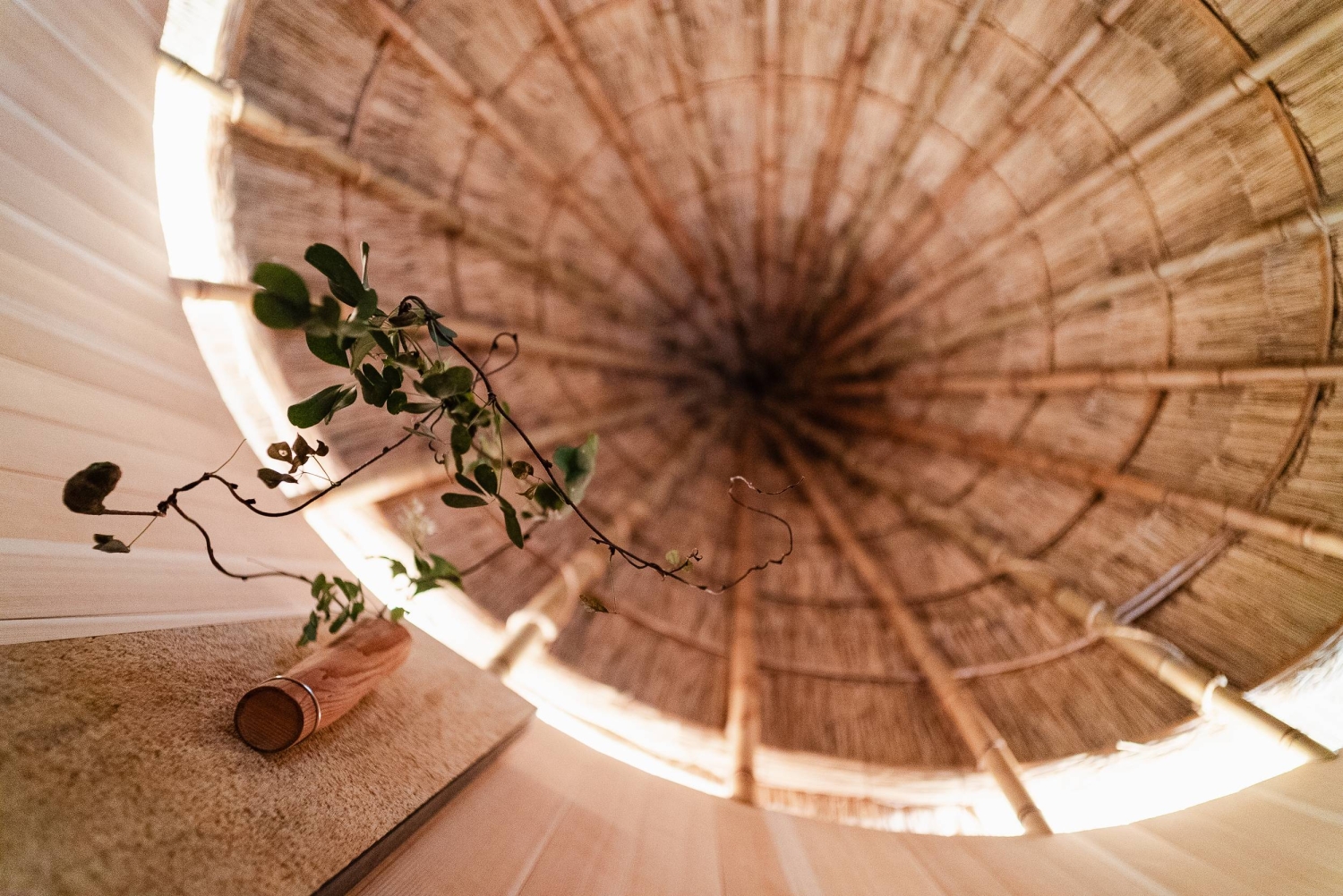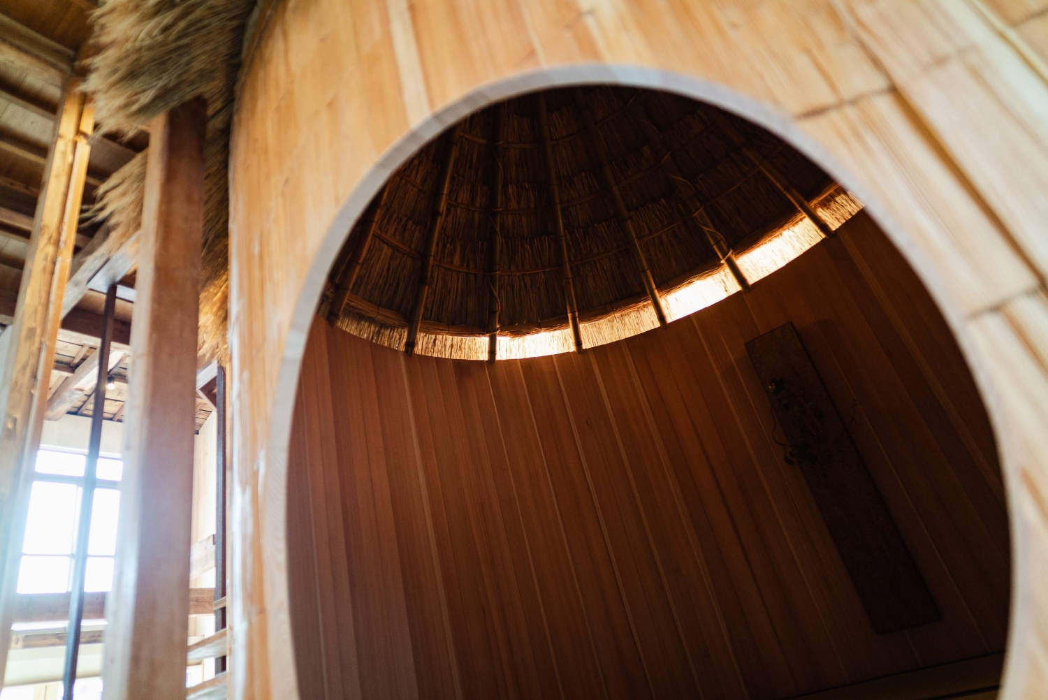 The Kanazawa structure in Ishikawa Prefecture is Nakagawa’s third iteration of his teahouse in a year and a half, this one with a thatched roof built by Kobe-based artisan Ikuya Sagara. At 3 meters across and 2 meters tall, it’s constructed using the same technique as the traditional bucket once used in daily life, for bathing or as containers for rice or sushi, among other uses. Where a typical bucket might use 15 staves, the tea house uses some 80.