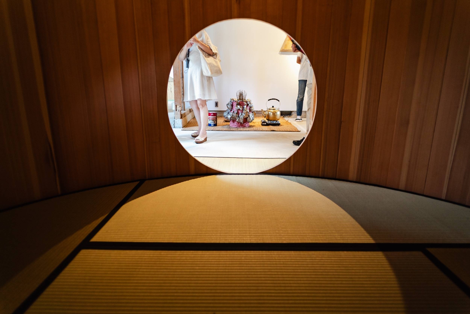 In a quiet neighborhood of Kanazawa, behind a heavy wooden door flanked by rows of filtered glass, a tea ceremony is underway. The smells of cedar, tatami, straw and matcha blend together and curl into the nostrils of the rapt audience. For all its pleasing sensuality, this is not a classic ochakai gathering. For one, the tea master is spooning matcha out of a large can marked Nissan motor oil; for another, the tea house is built like a bucket.
