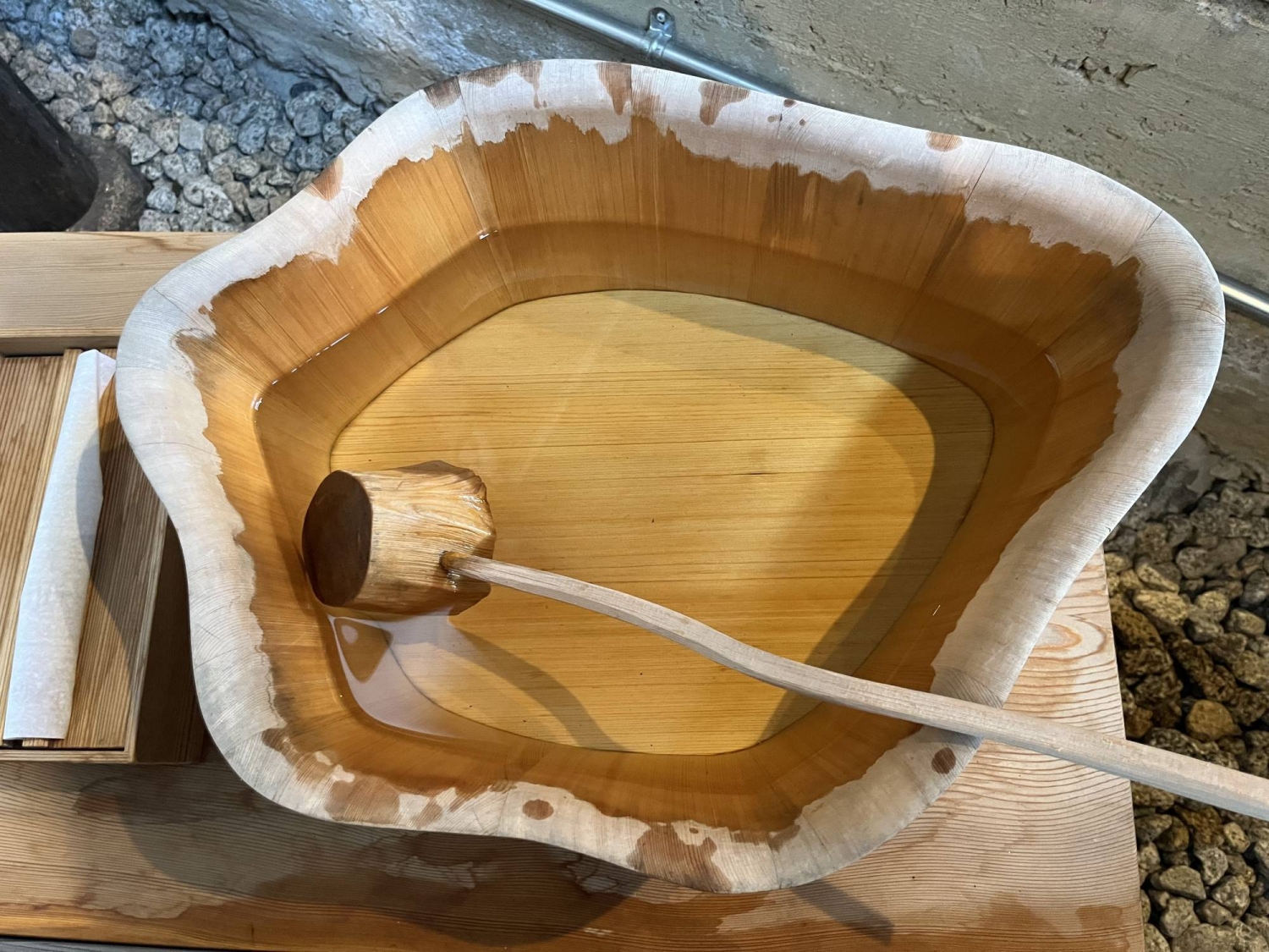 The technique has been around for centuries. Individual wooden staves are held together by a metal band. Tighten the band, and the wood pieces stay in place; knock it loose, and the structure falls apart. Because wood expands when it’s wet, the very act of filling the bucket with water is what prevents leaks. In theory, it doesn’t need anything else, though the staves might be reinforced by bamboo nails or glue. The idiom “taga ga hazureru,” meaning to let down one’s guard or “become unhinged,” as one colleague put it, is thought to come from the loosening of the band around an oke bucket.