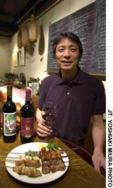 Torifuji's owner, Kazuhiro Harii, is venerated among Japanese wine cognoscenti. He is an unassuming, artsy-looking fellow who may be wearing a T-shirt and jeans when you arrive. Harii-san is formidably knowledgeable and he has been a longtime champion of Californian wines in Japan. In particular, he loves intense Zinfandels (we're talking deep, blood-red Zin here; don't dare tell him that there's a pink version). He began to introduce old-vine Zins to his customers years ago, when the grape varietal was entirely unknown here. If you hanker for something rare -- say, a micro-production Zin known only to the winemaker's own friends -- chances are pretty good that Harii-san has tasted it and maybe even has a bottle hidden somewhere in Tokyo.