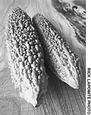 Before we begin our washoku review, here is a quick recipe for one of the late-summer gourds. Called nigauri (bitter melon) all over the archipelago, this ugly vegetable is called goya in its native Okinawa. This simple combination of pork with nigauri is a classic, inspired by Okinawan cuisine but thoroughly washoku. The myoga shoots used as garnish are just coming into season.