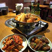 On some tables you will observe meat being grilled with gusto, not just kalbi beef but also pork and chicken, as well as a small selection of seafood and vegetables. Nothing wrong with that, of course, but you don't want to spoil your appetite for the main event -- the hearty stews that are the house specialty at this time of year.