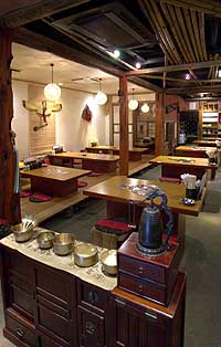 Rough-hewn planks and rustic wooden doors mark the entrance. One wall of the dining room has been given the daubed-mud look, not with the understated refinement of a Japanese tea house but using a coarse mixture of chaff, straw and barnyard grit. Clusters of garlic and dried sweet corn hang in the corners, sandals and bags of woven straw adorn the far wall, next to a women's chogori jacket. A haphazard arrangement of bamboo rods covers much of the ceiling.