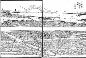 Blessed by the rising sun, we see in these prints the city of the shogun awakening to start another day of dynamic activity. Large cargo vessels enter Edo Bay from all directions. Swarms of small boats, looking like ants, busily ply the rivers and canals. The various towns arranged in orderly squares are packed with buildings, and streets bustle with people.