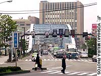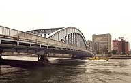 Leaving the shrine, go left and left again to return to the highway, where you should go right to reach Eitai-bashi. The blue iron bridge, built in 1924-26 following the 1923 Great Kanto Earthquake, spans the Sumida River a little downstream from where its wooden predecessor once stood. The view from the bridge reveals one of the most dramatic changes in Tokyo, with the new Chuo Ohashi suspension bridge and the Harumi Canal forking left. The cluster of high-rises straight ahead stands on the former Ishikawa and Tsukuda islands, which are now connected to a large area of landfills in Tokyo Bay.