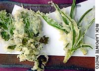 So I guess it was simply that I forgot myself when the lubricated celebrants asked me to break out a Western dish for the next course. I wasn't thinking — or I was thinking too hard — but what I came up with was a tempura of those delicious strawberries served with a black pepper and Gorgonzola sauce painted on the plate.