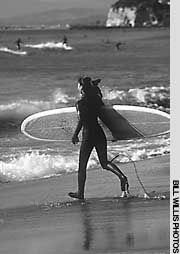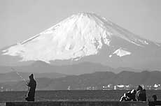 Enoshima tends to live somewhat in the touristic shadow of the higher-profile Kamakura, a few kilometers up the Kanagawa coast. Kamakura is a place that, throughout the year, hauls in throngs of visitors hungry for its temples. And it is also the place that in summer hauls in more throngs thirsting for its beaches -- even though they are dusty, gray stretches of grit and sand. The beaches on the mainland opposite Enoshima Island never seem to get quite as packed as those at Kamakura, and the Enoshima sand looks decidedly more inviting. But Enoshima and the nearby coast have something that Kamakura pointedly lacks -- the spectacular hulk of Mount Fuji gracing the horizon.
