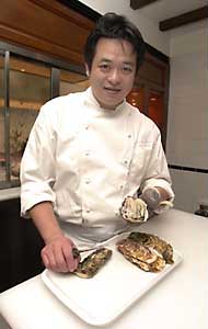 The pan-fried fillets of isaki (grunt) were straightforward, but none the worse for it -- nicely crisped, served on a sauce of creamed artichoke and garnished with slices of grilled artichoke heart. More inventive was the shirakawa (white horsehead fish, brought in from Hong Kong) wrapped inside a pan-fried parcel of brik pastry, along with mussels, strips of leek and fine-chopped champignons. Tres bon.