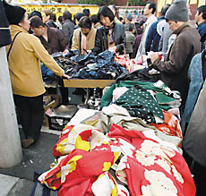According to Hideo Aikawa, a representative of the local merchants' association, in recent years about 30 percent of the stalls have been selling antiques. Ones selling used clothes and kimono account for about 20 percent. "As a result," he said, "many foreigners are among the crowds of customers hunting for bargains."