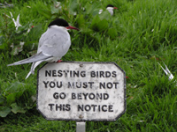 But those terns don't like company. Ow! Hell's teeth! Terns rise from their eggs and fly shrieking at our heads. They flutter in front of our faces, they peck our scalps (drawing blood, the little blighters) -- and to round off the performance they void their bowels in our hair.
