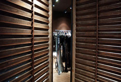 Although there are no such items for sale at the Tokyo branch, its interior is filled with eye-catching antiquities from Europe that lend the terracotta walled space an ostentatious air. The exterior of the store is a glass wall backed by huge wooden shutters framed in rusting iron. Hadida explains that he deliberately eschews display windows, saying he wants people to come in to the stores as "volunteers" -- not having been mesmerized by flashy mannequins.