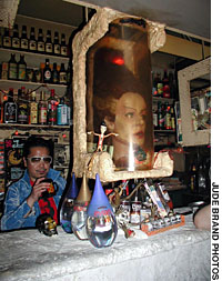 Dozens of other bits and pieces of horror-store paraphernalia -- masks, body parts and wind-up whatnots -- line the bar top and shelves.
