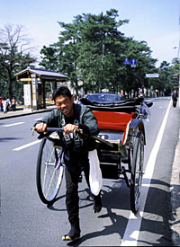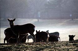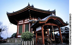 Among the souvenir shops that line Nara's main street, the only serious rival that Todaiji and its Buddha have as icons of Nara are the well-known deer that hang around Nara Park. For the early-morning visitor to Nara Park, the deer are not a bad icon for this pint-size city -- the screeching bark of the ruminants sounding mournfully out over the sparse green expanse of the park. Walk around here in the middle of the day, though, when the animals are at their friskiest and the experience becomes a rather different one of feeling the sudden furry brush against the back of one's hand as some doe opts for the direct method in shaking a tourist down for a snack.