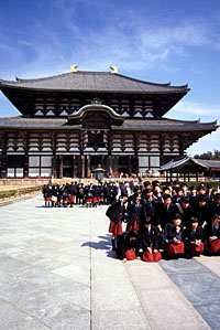 Today, as then, that giant Buddha is the main feature in Todaiji. And big the 400-ton sculpture certainly is -- so large, the same priest assured me, that a full-grown man could, if he felt so inclined, crawl up into one of the nostrils of the Buddha. For those familiar with the dignified giant Buddha in Kamakura, it is hard to see its bigger cousin as anything but aesthetically challenged. Todaiji's Buddha exerts an air of repose, though not so much a spiritual one as that of one who has just indulged in a hefty Sunday roast dinner -- an impression enhanced by the fleshy face and incipient jowls.