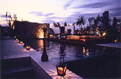 This place boasts decor and staff from Japan, New York and Italy. Tucked away at the back, a traditional sushi bar is accented by trickling pools, the subtle scent of incense and steppingstones leading to private dining rooms waited on by kimono-clad women. To the west lies a semicircular N.Y.-style bar with a spacious lounge area hosting an eclectic mix of live music played around a grand piano and a view onto the terrace, which faces a waterfall down a rocky wall. While the cuisine and drinks are generally reasonably priced, those willing to fork out a hefty hunk of extra cash have access to fat fluffy pillow sofas in the VIP areas behind the waterfall. As for the Italian angle, chefs toss pizzas in the open kitchen and slide them into an authentic Naples pizza oven. The wood deck outside offers an open-air lounge with sofas for large groups, surrounded by shrubbery. To the front is a third Bali resort terrace, also enclosed by greenery and a long stretch of tables under a pergola.