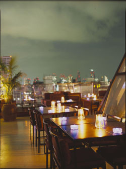 Half the fun is getting to this joint. After disembarking from the lift to enter the ninth floor's bar and lounge, rooftop ramblers are led around an opening in the floor that looks down on a lavish restaurant serving traditional Japanese cuisine. Diners below are scattered around the base of a huge Benjamin tree that branches up through all three levels, making one feel like you've just climbed Jack's beanstalk and will soon discover something magical. Upon reaching the portal to the peak, the anticipation builds with the appearance of a somewhat shaky-looking staircase. Mounting the stairs provides a mild test of bravery (thus no food service on the rooftop), but like many great climbs, the view at the summit is well worth it. The Benjamin treetops are enclosed in a glass pyramid jutting up through the center of the roof, and surrounded by potted plants, trees, and voguish tables, sofas and reclining chairs. Lazing around with a hot buttered rum, ambient music and a view of several neighboring districts, Navi is a prime place to relax with a date when the only plan is to while away the hours in an elegant and sophisticated atmosphere.
