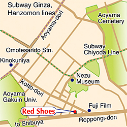 Ten years ago, the bar's owner passed away, and we were suddenly left with no shoes at all. Then, in December 2002, the current owner -- having acquired the Raijin and Fujin portraits from the original bar -- decided to open a new version of Red Shoes. Although the original location of the bar was not available, premises were secured on the same side of Roppongi-dori, but further toward Shibuya, in -- ironically enough -- the last deserted stretch of the street.