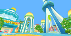 Once you've decked out your character and set a personal profile, you can wander the 3D environment, using portals to teleport to different locations. Currently the Beta version includes two fleshed-out landscapes: Future Town and Rock Town. Wandering around these very different spaces is slow but simple, with the keyboard's arrow keys controlling your avatar and mouse-clicks interacting with scenery and other avatars.