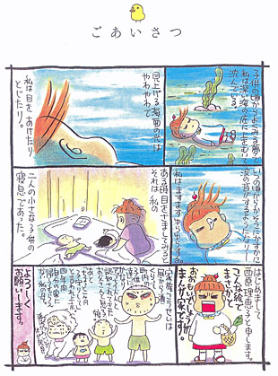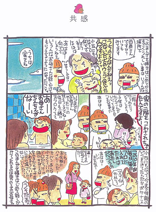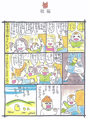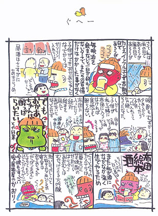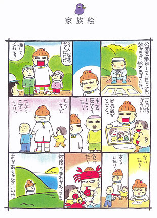 Rieko Saibara is a catoonist known for her work that has both a lyrical and "rebellious" side to it. While regarded as a rebel in the cartoonist world, at times shocking her readers with indecent expressions, she also brings them to tears by her portrayal of hopeless poverty, affection to her children and descriptions of separation with her husband. The cartoons introduced here are from her series "Mainichi Kasan", which three books so far sold 500,000 copies and won several prizes - including the Cultural Affairs Agency's media art festival award in 2004 and Osamu Tezuka Cultural prize in 2005.