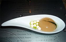 His Blue Hawaii, for instance, is inspired by shaved ice — but in true "tasty science" style it uses liquid nitrogen for instant refrigeration. With lots of air in it, the ice melts in a split second leaving a unique sensation in the mouth. Meanwhile, his miso soup looks just like a brownish egg yolk with marbles of tofu on a wide Chinese spoon. Swallowed in one gulp, it tastes exactly like the real stuff.