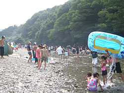 To the right, hordes of people of all ages entertain themselves in Akigawa River's shin-deep water with every type of water toy imaginable, from fishing nets to goggles to beach balls.