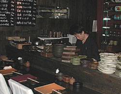 The first-floor bar is a low glass counter that seats six on white linen-covered restaurant chairs. The walls and floor are dark wood. The glass shelves behind the bar are custom made and designed to display bottles of shochu, but rather than standing the bottles up, they are laid on their side. A junk-antique Chinese bench is propped up under the window, which is also half covered in rough bamboo slats that serve to further filter the view from the street. It is a simple understated mix of modern and traditional touches.