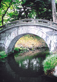 The trip down to the pond's edge, with its waterfalls and precipitous, slippery paths, can be treacherous, but 5 minutes into the overgrown woods, classrooms and city noises vanish. The surrounding Ikutoku-en (Virtue-nurturing Garden) was designed by Toshitune Maeda in 1630, and Sanshiro Pond was shaped, and named, for the Chinese character kokoro (heart). Its current sobriquet was derived from Natsume Soseki's coming-of-age novel "Sanshiro," the story of a country-boy Todai freshman encountering the modern world.