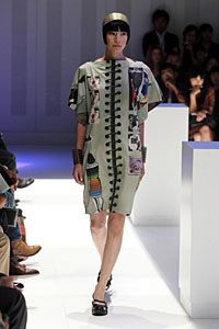 But it was Fraga's collection that brought the sights and sounds of Rio and San Paulo to Tokyo. Live vocals by pop legend Fernanda Takai seemed a deft touch, and with retro minidresses, blue bikini briefs and other outfits in oceanic colors, we could almost believe we were sitting on the Copacabana beach.