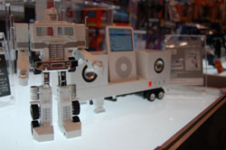 Here the toy is again whitewashed, a nod to the iPod, for which this is a licensed product. But aside from that, it looks identical to the original Optimus Prime (although of course his buddy Ultra Magnus was the "white Prime" back then).
