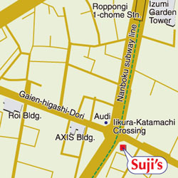Spend too much time wandering down the main Roppongi drag and you start wondering what country you're in. Since Suji's threw open its doors earlier this year, close to the Iikura-Katamachi Crossing, that particular stretch of Gaien-Higashi-dori has started to feel more like Main Street, USA.