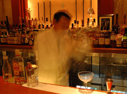 So Kon takes me to the luxury Tokyo playground. On Sotobori-dori, Bar Tender (5F, 6-5-15 Ginza, Chuo-ku; [03] 3571-8349) is a sedate lounge bar in which staff sport cream cocktail jackets and hairstyles that wouldn't twitch in a wind tunnel. With their pinky fingers cocked, they meticulously pour ingredients into silver-plated cocktail shakers. Then, as though somebody suddenly pressed fast-forward, they burst into full-throttle, elbow-thrashing shakes.