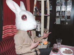 Sachi and Yuka are the princesses of darkness who run this 14-seat establishment, serving cocktails with names such as young Gretel's suffering (vodka and cocoa) and tragic marionette (whisky Cointreau), whose bitterness, claims the menu, is provided by tears. Sumire no Tenmado is one of the newer establishments on Golden Gai, Shinjuku's time-worn drinking district. The area has a well-deserved reputation for dishing out tepid welcomes to unfamiliar faces, and there is no reason to suspect that this dark box with blood-red velvet drapes and ghoulish paraphernalia will be any more inviting. But gothlolis are only eerie on the outside, and Sumire no Tenmado is hospitable and fun, if not exactly jolly.