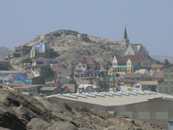 A quick peek at the straining roof. A glance at our nice blue car. A stone seems to have cracked the windshield. There is an unbelievable quantity of airborne material. All of it incoming. We take his advice and go back to the only place possible, Luderitz, a Scooby Doo mini-port crowded with bizarre mansions and haunted warehouses. Nice seafood. But a spooky place.