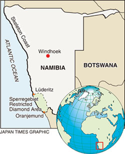 Oranjemund, incidentally, is a mining town on the bank of the Orange River that marks the Namibian/South African border. It's also off-limits to anybody who cannot assemble the mass of documents (permits, police clearance certificates, etc.) demanded by its formidable security machine.