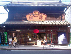 The map next led me to Ejima, a dealer in tea and Japanese paper. Here the blue banner is superfluous as the exterior exudes a museum atmosphere, with its latticed second-story windows and its bracket-supported horizontal timbers bearing the weight of the great eaves. The building dates from the 1920s, Ejima from 1661.