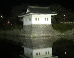 I walked along the castle moat and revisited the castle park. The milk-white donjon, the foundation nearly invisible in the dark, seemed borne by its broad eaves.