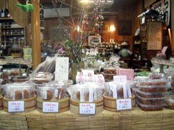 On to Matsuzakaya, which displays 48 kinds of Japanese sweets from local confectioners. Above a display case sit a miniature camellia sasanqua and a cage of canaries. You could eat them; they are made of the same ingredients as cakes.