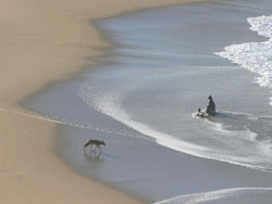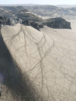 After leaving our hyena research station, we visited a number of very unusual beaches and islands. These were occupied by raucous and malodorous colonies of Cape fur seals and were stalked at low tide by jackals and brown hyenas looking for unwary blubber. In one location, the hyenas had established lairs in caves above a mountain of sand (with excellent sea-front views) and their footprints as they descended and then returned formed an extraordinary pattern.