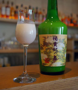 If daiginjo is the thoroughbred of sakes, the cloudy, white nigorizake is the pantomime horse, silly, fun and full of character. The milky color comes from rice mash — the stuff that is filtered out of more sophisticated sakes. As a result, nigorizake is much punchier and often more potent than its filtered brethren. The mash can impart a wide variety of flavors, but in the case of Youkihi it's a tart, bitter jab to the tongue.