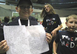 Coming to Japan gave the children an excuse to study the Japanese language and culture. Colin Putman, aged 12, said he picked up some Japanese characters from a book, showing a sheet full of meticulously written kanji and katakana. He also watched "Seven Samurai," a 1954 Akira Kurosawa movie, with his family. The youngest member of the team, 10-year-old Hal Batty, designed the black T-shirt with the ingenious Tech HEds logo, featuring letters made out of gears, magnets and such.