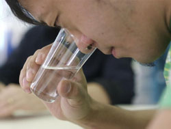 In the first unanimous decision of the tournament, Blue Spring trounced tap water that had been filtered through an ¥80,000 contraption called the Aqua Meister. Swinnerton cannily criticized the filtered water for tasting "processed." Most of us thought that tap water tasted better unfiltered.