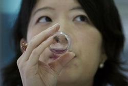 "I think this one is Willow," said Yamanaka. Blind tasting doesn't really work when someone knows all the flavors. Our aqua sommelier says she can tell waters apart even when they're in coffee. Willow, from England's Lake District, is the Aqua Store's top-selling water, but it lost to Fine, which filters through the volcanic rock of Shuzenji on Izu Peninsula.