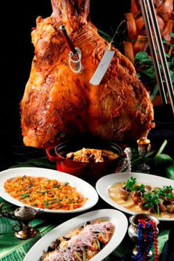 Cafe Tosca has a "Caribbean" theme with nautical decorations, staff dressed in pirate costumes and Caribbean-style buffet menus. Dishes include pork loin chop grilled in banana leaves, spicy shrimp curry and a whole leg of carved roast beef.