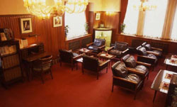 We got off the elevator on the fifth floor (it goes no higher) and climbed the burgundy-carpeted spiral staircase to the sixth. A portal under the word "Mozart" led to a second spiral staircase. The room at the top was decorated with the composer's portrait and a replica of a page from the score for his "Magic Flute." Before the window sat a stereo set. The sole room on the floor, in "Mozart" guests can play the classics fortissimo.