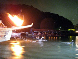 The thrill of watching ukai at Kisogawa is that it all happens so close to the viewing boats. You can literally feel the heat of the flames, see the birds straining at their leads (it looks like they're pulling the boat) and even lean over the edge and see them careening underwater after fish. Soon each flash of silver visible in their beaks after they surface is greeted with cheers from the viewers.